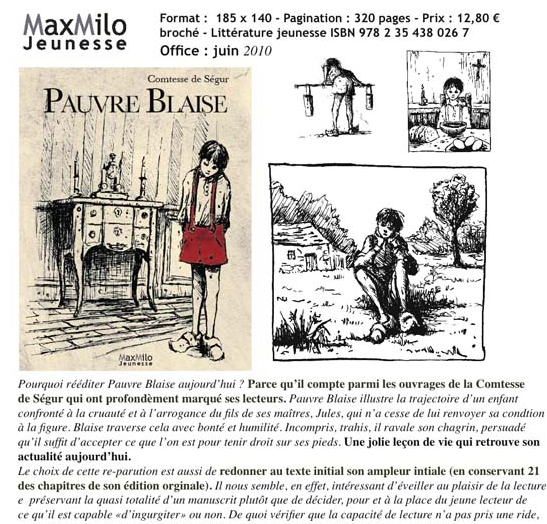 Les éditions Max Milo rééditent Pauvre Blaise de la Comtesse de Ségur, mais deux chapitres ont été supprimés : celui relatant la première communion du petit domestique pieux et celui qui décrit la mort par noyade d'un petit garçon de deux ans où l'auteur insiste sur le recours à Dieu face à l'épreuve.